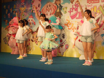 人気テレビアニメ「ジュエルペット」の新シリーズと初の劇場版「映画ジュエルペット スウィーツダンスプリンセス」の制作発表会見が、3月30日帝国ホテルで行われ、テレビと映画の主題歌を歌う芦田愛菜ちゃんが登場した。