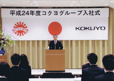 黒田社長は「去年の東日本大震災を機に、お客様の価値観は大きく変わった。コクヨの社是は『商品を通じて世の中の役に立つ』だが、求められているものは今までとは大きく変化しつつある。今年、多くの外国籍の方を含む新入社員を迎えられたことは、コクヨにとって大変よい戦力を得られたと考えている。これからのコクヨは、皆さんとともに日本やアジアでのものづくりを再びゼロから作り上げ、アジアに向かって飛躍していく。全社員が一丸となってお客様に価値を届け、新たな期待値を訊き、またその価値を届ける、というサイクルを進めることで、ともに成功を作り上げていこう」と挨拶した。