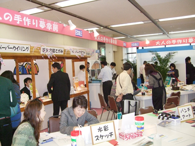 5階イベント館は大人の手作り夢幸房として、屋台風の構成で水彩スケッチ、大人のおり紙、パンチアート、ペーパークイリング、筆文字絵てがみ、ペーパークラフト、玩具コーナーなど、クラフト・ホビーを主に提案した。