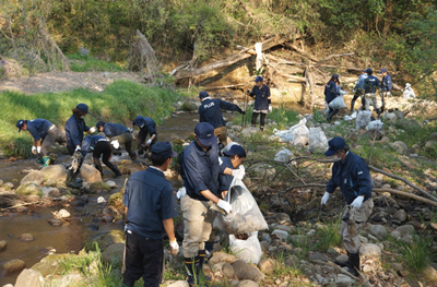 作業は工場敷地内を流れる1.2kmと敷地外の上・下流約1kmの流域が対象で、川の両岸と浅瀬を中心に、空き缶・ビニール・発泡スチロールなどのゴミを分別収集し、所定の集積場所へ運搬、品目別に集計する。