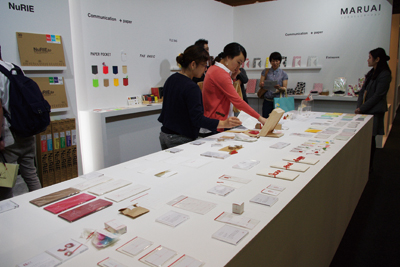 マルアイは、オフィスのコミュニケーションを円滑にするスタンプや領収書のようなデザインの招待状など、楽しい商品を紹介。水引で結んだ縁起物のチャームタグは、多くの来場者が手に取り、注目を集めていた。