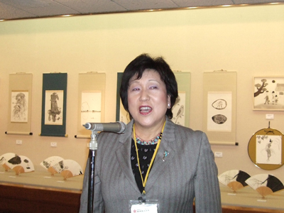 同社はTISに多種類の墨汁を提供、書に限らずイラストなど自由に創作してもらい、約220点を展示した。同社田中葉子社長は25日夕の前夜祭で、「今年当社は創業111年を迎え、墨汁を発明した企業として、さらの多くのご愛用者にさまざまな使い方を知っていただくために、TIS安西理事長のご快諾を頂いて実現した」と語った。