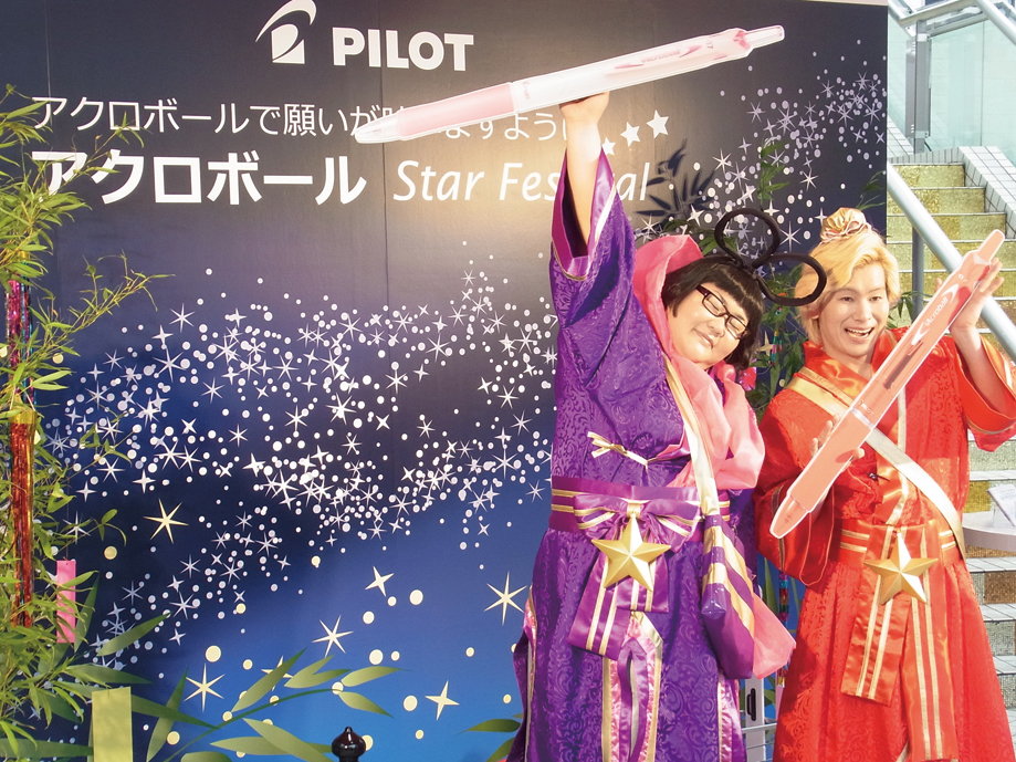 七夕の短冊にアクロボールで“なめらかに”願いごとを書いて笹に飾った来場者に、アクロボールをプレゼントするイベント。