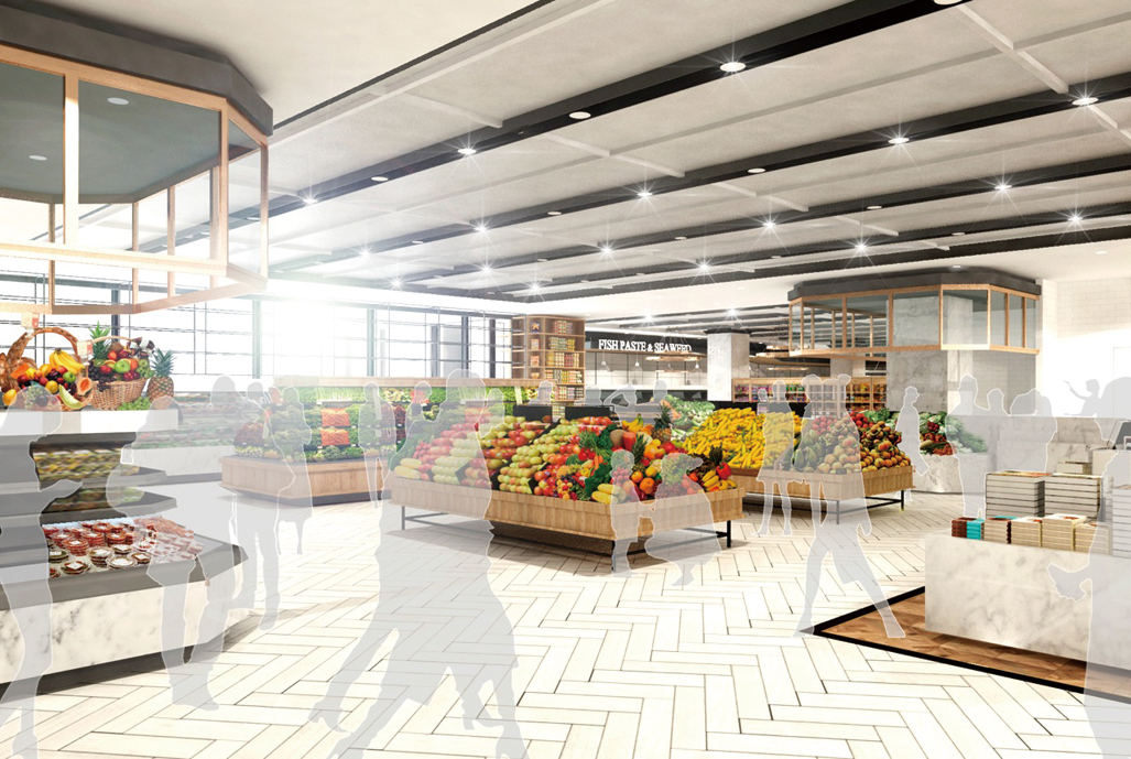 新しいフロアは、顧客のデイリーニーズを満たすだけではなく、「食」と様々なジャンルをクロスすることで生まれる体験、楽しさ、癒し等の新たなライフスタイルを提案。ゾーンは「嗜む」「作る」「食べる」「過ごす・暮らす・学ぶ」の 4つに編成。それぞれが、時間帯に応じて異なるMDやサービスを提供し、食に関するあらゆるニーズに応える。スーパーマーケットにクイーンズ伊勢丹が入居し、フードコートやカフェを設ける。