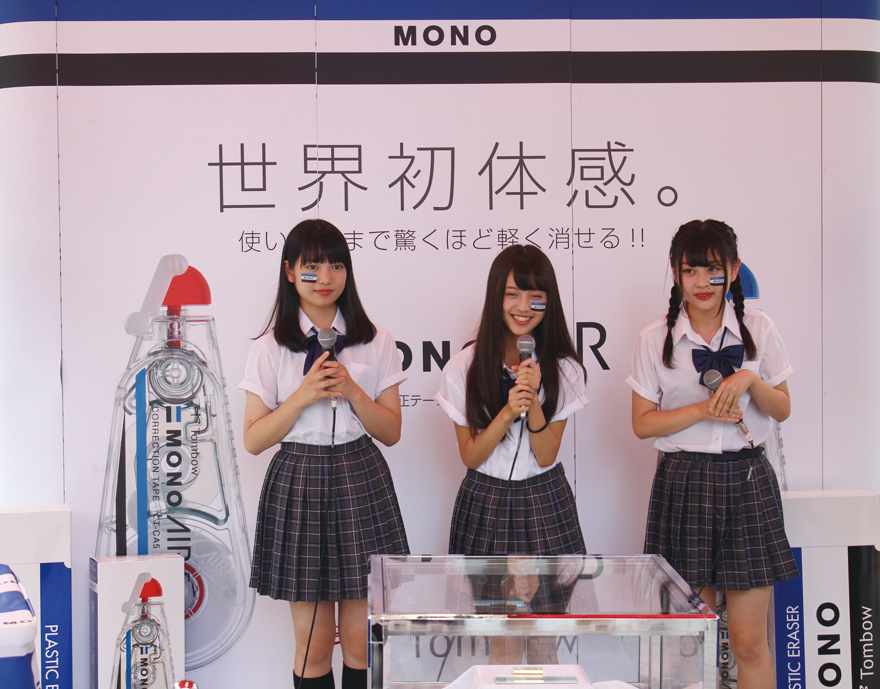 トンボ鉛筆は、学生の夏休みに合わせた8月20日午後、女子高生や社会人女性に人気のスポットである東京・渋谷109前のイベントスペースで、新発売の修正テープ「MONO AIR 世界初体感イベント」を開催し、買い物客、観光客、花火大会に行く途中などの大勢のユーザーが足を止め、600名がその軽さを体験した。