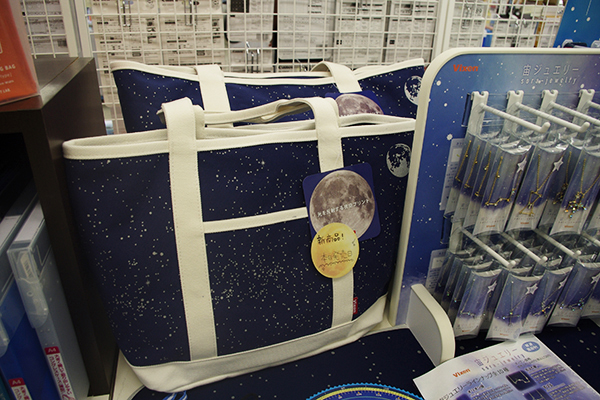 新規出店のビクセンは、天体望遠鏡などを扱う総合工学機器メーカーで、宇宙をテーマにした雑貨や文具なども展開。SNSでも話題になっている「宙トートバッグ」、メモ帳や付せんなどの「スターパーティ ステーショナリー」、星座をモチーフにした「宙ジュエリー」を展示した。トートバックは、星の部分が反射材になっており、暗闇ではほんのりと光るようになっている。