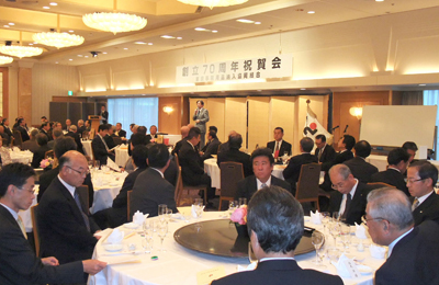 日本の文具及びオフィス用品納品業団体として最大の売上げと実績をもつ、東京事務用品納入協同組合(東事協、加盟32社、理事長・森静雄モリイチ社長)が今年創立70周年を迎え、5月20日午後5時30分から東京港区・ホテルオークラで生産、流通、同業友好団体14の代表を招き、総数153名で祝賀会を催した。