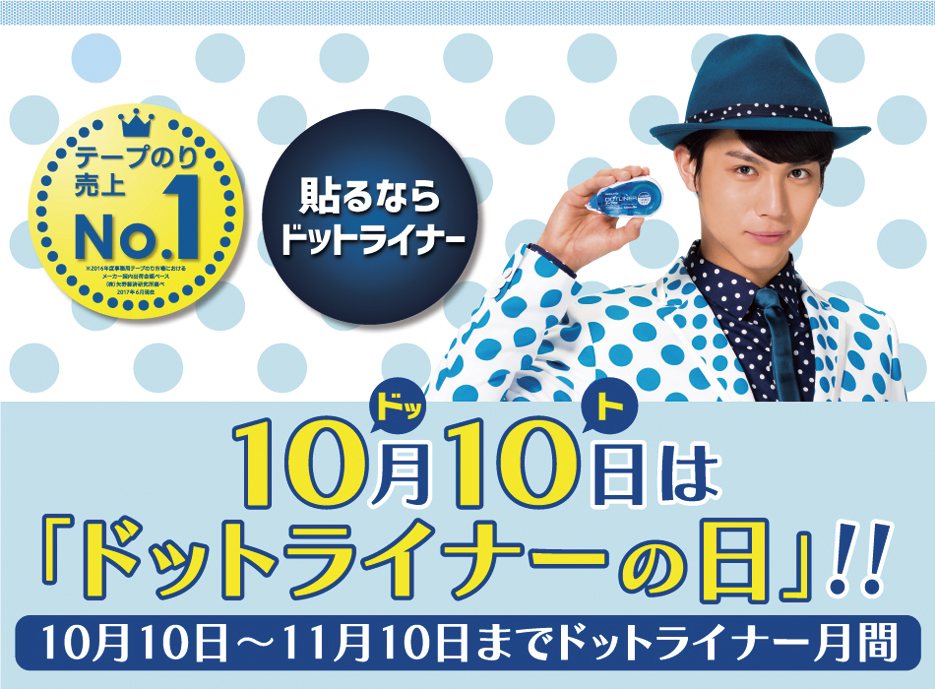 コクヨ(黒田英邦社長)は「10月10日」をテープのり「ドットライナーの日」として一般社団法人日本記念日協会によって認定されたことを記念し、10月10日(火)~11月10日(金)を「ドットライナー月間」と題し、様々なプロモーションを展開する。