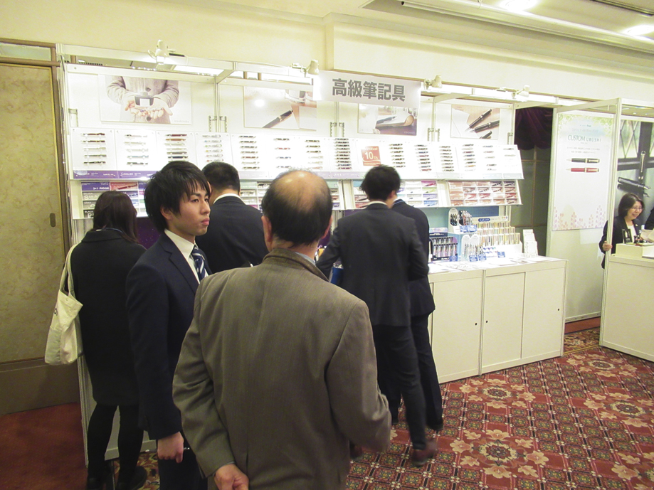 会場は高級筆記具、筆記具、文具コーナー等で構成。新年度・新学期を迎え、既存製品のラインナップ拡充を行い、新シリーズ、コラボ製品等の投入で需要の拡大を図った。