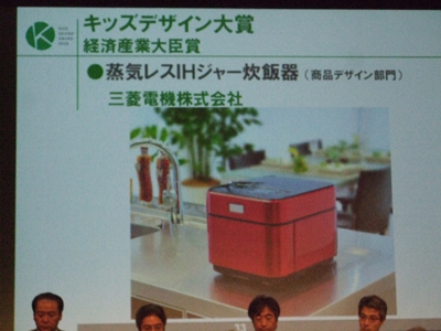 第3回キッズデザイン賞の記者会見とプレス向け展示会が8月5日、港区北青山のTEPIAで行われ、キッズデザイン大賞(経済産業大臣賞)には、蒸気を出さない三菱電機の「蒸気レスIHジャー炊飯器」が選ばれた。