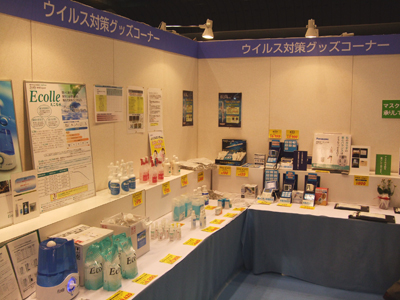11日~12日に広島で行われたフォーデックでも、同コーナーが設けられた。展示されたのは、抗菌仕様のボールペンの他、うがい薬やのど飴、マスク、空気清浄を行うイオン発生器など、ウィルス対策をキーワードに並べられ、注文も受け付けた。