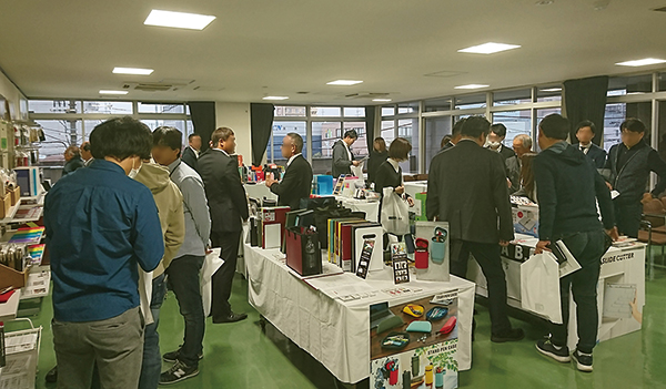 前週の9日に東京で行われた「Avanti 2020フェア」で発表した新製品とノベルティ商品などを展示し、具体的な売り場提案も実施し、折りたたみ式のコンパクトスライドカッター(A3ヨコ対応)と国産帆布の富士金梅を使用した(ひねも)シリーズのポーチが大変好評だった。