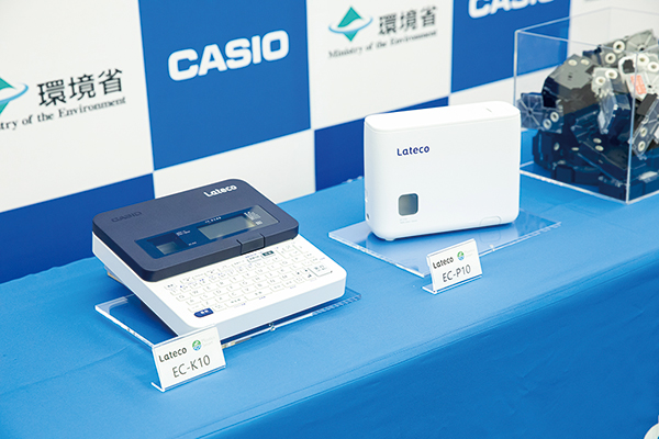 カシオは、テープ詰め替え方式を採用したラベルライター“Lateco(ラテコ)”を2019年より販売。カートリッジを繰り返し使用することで、従来機種に比べプラスチックごみを約97%削減している。