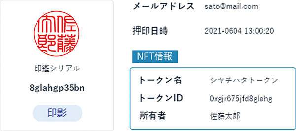 NFT(Non-Fungible Token:非代替性トークン)とは、「偽造不可な鑑定書・所有証明書付きのデジタルデータ」のことで、「NFT印鑑」は、印影データをNFT化することで、印鑑保有者の情報と印影情報を結び付けた、固有性を持つ電子印鑑。