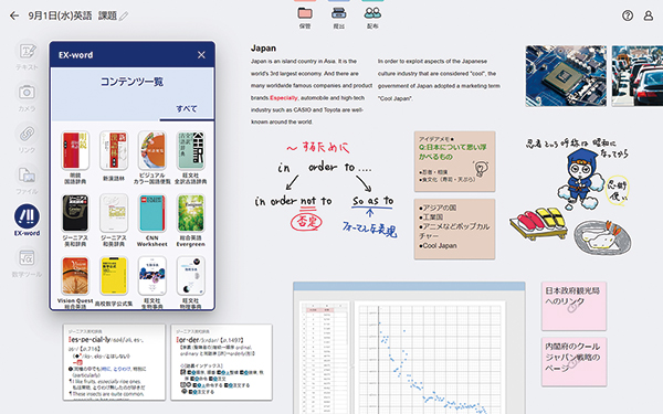 「ClassPad.net」は、電子辞書“EX-word(エクスワード)”で好評の良質な辞書・学習コンテンツや作成自由度の高いデジタルノート、先生と学生間の課題のやりとりをサポートする授業支援機能、グラフや図形を簡単に描画できる数学ツールを搭載したオンライン学習プラットフォーム。