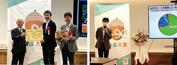 結の森プロジェクトについて「文具会社と地元森林組合の共同により、間伐材を用いたブランド文具の開発・販売にとどまらず、生物多様性保全と地球温暖化防止対策、地元高校生との植生や河川の水質に関する調査、活動内容の効果的な情報発信など、幅広い活動を展開されています。2006年に約100haのモデル林から始めた森林管理は5,425haまで拡大し、すべてFSC®森林管理認証を取得しているほか、通販子会社にて購入者のポイントをプロジェクトに寄付するしくみも設け、毎年100件以上の申込みを受けるなど、森林保全と地域経済の振興を両立させたことが高く評価されました。」として、審査委員より評価された。