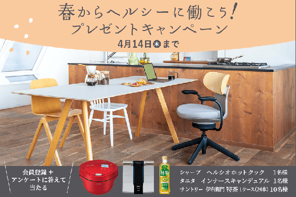 コクヨは、3月15日~4 月14日、公式ECサイト「KOKUYO Workstyle Shop(https://workstyle.kokuyo.co.jp/)」にて、春からヘルシーに働こう!プレゼントキャンペーンを開催する。