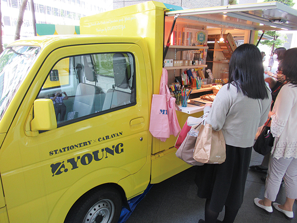 オカモトヤ(本社・港区虎ノ門、鈴木眞一郎社長)は、6月2日が同社創業110周年にあたることから、文具の移動販売車両「ヤング号」を地元虎ノ門に出店し、4時間だけの販売ながら大盛況だった。