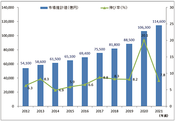 前年は同調査開始以来初めて 20%以上の伸び率だったが、2021年度は例年並みの7.8%の伸び率だった。直近10年の平均成長率は8.5%と、マイナス成長を記録した1998年度以来、23年連続して増加傾向が続いている。