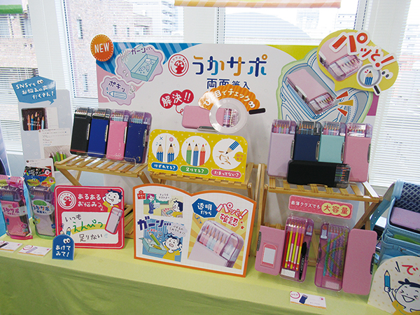 「うかサポ」両面筆入(11月発売)は最薄クラスでも大容量。鉛筆の削り忘れや本数不足を、筆入れを開けなくても透明窓で確認することができる。ランドセルに横向き、前ポケットにも入るサイズ感。デザインは無地と刺繍を揃えた。