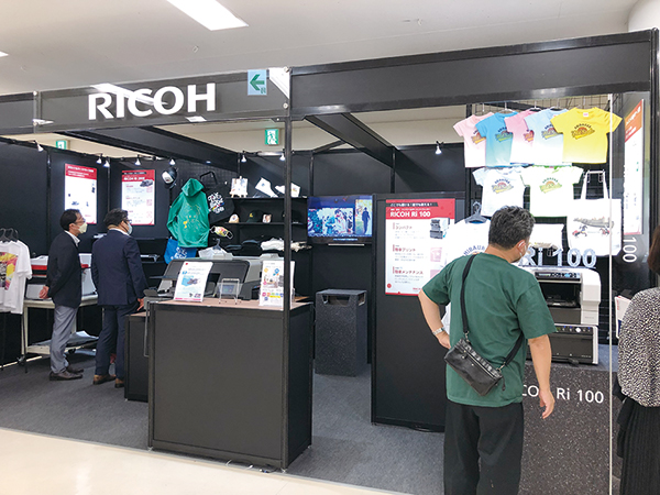 Tシャツはもちろんトレーナー、トートバック、タオル等多くの綿製品へのプリントができる、ビジネス用ガーメントプリンター「RICOH Ri 2000」、コンパクトガーメントプリンター「RICOH Ri 100」を出展し、デモ印刷を行った。