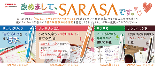 「サラサ」は2000年に発売を開始した、ジェルインクの特性を活かした鮮やかな発色と、さらさらとした書き心地が特長のボールペンシリーズ。