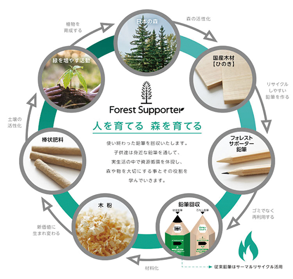 三菱鉛筆は「美しい森林づくり推進国民運動 フォレスト・サポーターズ」を運営している公益社団法人国土緑化推進機構の協力を得て、再生利用しやすい鉛筆として国産ヒノキ材から「フォレストサポーター鉛筆」を開発し、2021年11月から品川区郵便局で1年間のテスト発売を実施した。