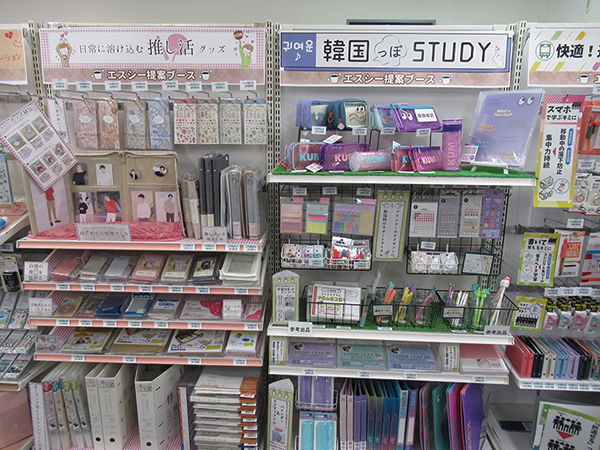 注目のエスシー企画コーナーでは、「快適!通学時間の学びサポート」「カワイイ♪韓国っぽSTUDY」「日常に溶け込む『推し活』グッズ」「かんたんかわいい!!押すだけ・貼るだけデコレーション」「おとなかわいいキャラで『すぐ分かる』収納」「14時からの外遊び~キャンプの空き時間をもっと楽しく~」「こども防災 防災グッズをつくってみよう!」の7つの売場提案を、データに基づきモデルゴンドラで具現化して量販店の売場活性化につなげる。