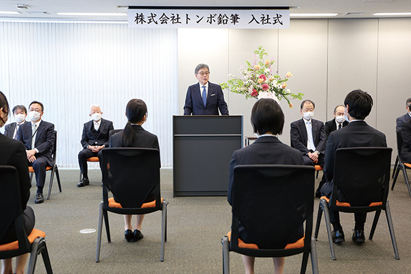 これに応えて、新入社員代表が「本日は私たち新入社員のために、このような素晴らしい入社式を催していただき、誠にありがとうございます。(略)トンボ鉛筆はお客様の喜びや感動に向かって革新を続け、時代とともに変化するお客様のニーズに応えてきています。これからトンボ鉛筆の一員としてお客様に寄り添い、暮らしを支える役割を担うことに喜びを感じております。」と挨拶した。