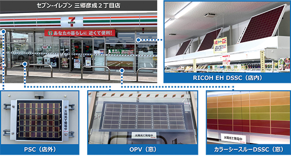 リコーは複合機の開発で培った技術を応用し開発した「次世代太陽電池」4種類を店舗へ設置。セブン‐イレブン店舗での次世代太陽電池の実証実験は国内初となり、店内照明や壁面、窓面でも新たなエネルギー創出が可能だ。