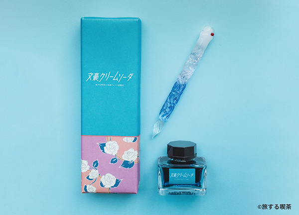 8月3日(木)~ 9月24日(日)の期間、丸善の丸の内本店、ラゾーナ川崎店、京都本店の3店舗で、クリームソーダを実際に提供するのに加え、オリジナル特典(敷紙ブックカバーとパフェスプーン置き)のプレゼント、ガラスペンやインクなどオリジナルグッズの販売を行う。