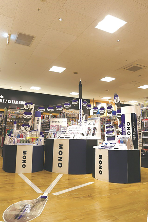 グランプリ店の陳列ポイントとして、「超MONO祭」として祭のやぐらをイメージした陳列にして、3つのやぐらから、「筆記具」「消しゴム」「のり」を探しやすいようにした。ディスプレイは全員で手づくりした。