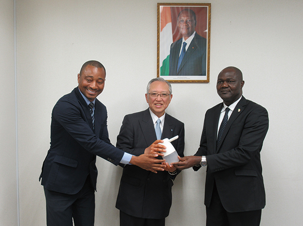 2月2日午後2時30分から、渋谷・上原の在日コートジボワール大使館で寄付物品の贈呈式が行われ、宮本社長から、駐日コートジボワール共和国大使館のアビオン・ラッシ・シルベール臨時代理大使とコートジボワール日本交流協会サコ・ランシネ会長に「テッテ」が贈呈された。