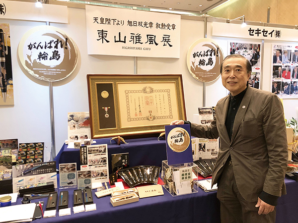 セキセイの出展ブースでは、西川雅夫会長こと、輪島塗創作師・東山雅風が「東山雅風展」を併設し、昨年に広島サミットG7のワーキングディナーで採用された輪島塗蒔絵ボールペン「雅風」の鹿柄や大阪サミットG20の鶴柄、伊勢志摩サミットG7の兎柄を一同に展示した。