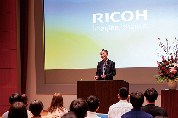 リコー(大山晃社長)は4月1日、2024年度入社式を行い、一堂に会する入社式を復活しながら、トップとの1on1パートも残す、というハイブリッド形式で実施した。