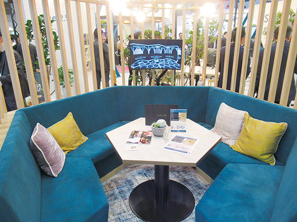 オリバーはホテルのラウンジにあるような木製家具で囲った円形ソファを展示。オフィスの執務フロア内にミーティング用に設置する。外から何をやっているのかが伺える半個室のような造りで、「新しい発想が生まれる空間となる」(同社)と提案した。