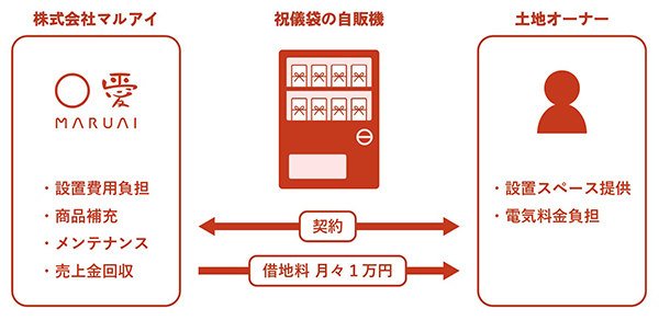 マルアイ)は、この度、自動販売機ビジネスに参入し、冠婚葬祭に使用する祝儀・不祝儀袋を24時間販売する自動販売機『祝儀袋の自販機』の設置を希望する土地オーナーを、2024年6月12日より募集開始した。借地料は月々1万円で、土地オーナーは売上実績にかかわらず安定的な収入を得ることができる。なお、設置およびその後の商品補充や代金回収、メンテナンス等は全てマルアイが行う。