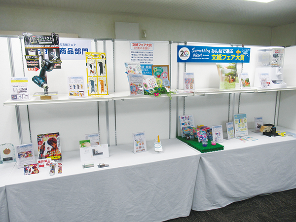 文紙フェア大賞エントリー商品は1階イベントコーナーに一堂に展示され、その中から金賞・銀賞・銅賞の3点を選び、獲得ポイント数の合計で三賞(3点)を決定した。