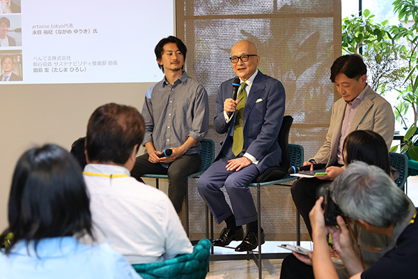 会場では編集者・評論家の⼭⽥五郎氏をはじめartwine.tokyo代表の永目裕紀氏、ぺんてる執行役員サステナビリティ推進部部長の田島宏氏が登壇し、「アートを日常に」のテーマでトークセッションが行われた。