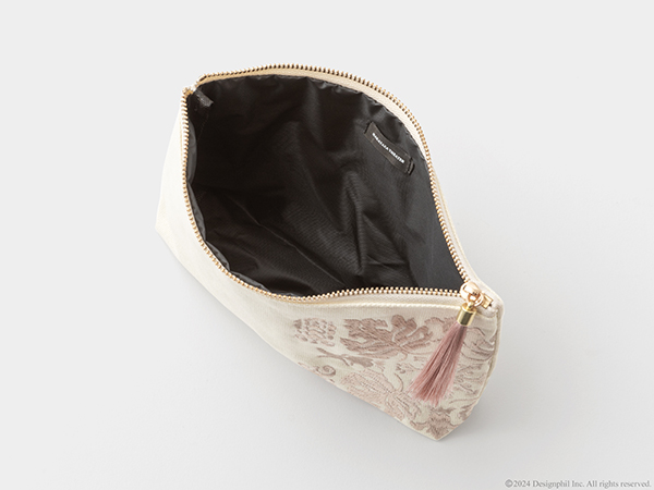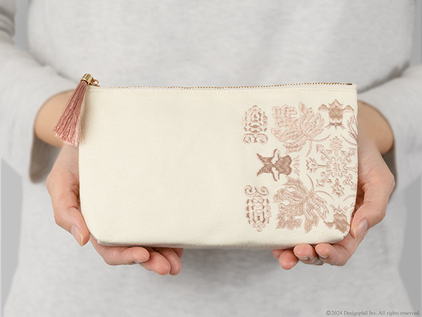 表面には、博多座の緞帳をイメージした葡萄唐草文様の豪華な刺繍をあしらった。博多座らしい上品な仕上がりを求めて、プリントではなく刺繍を選択し、細かい模様が美しく見えるよう縫う方向にもこだわっている。また、ファスナーの引き手は、緞帳の豪華なフリンジをイメージしている。