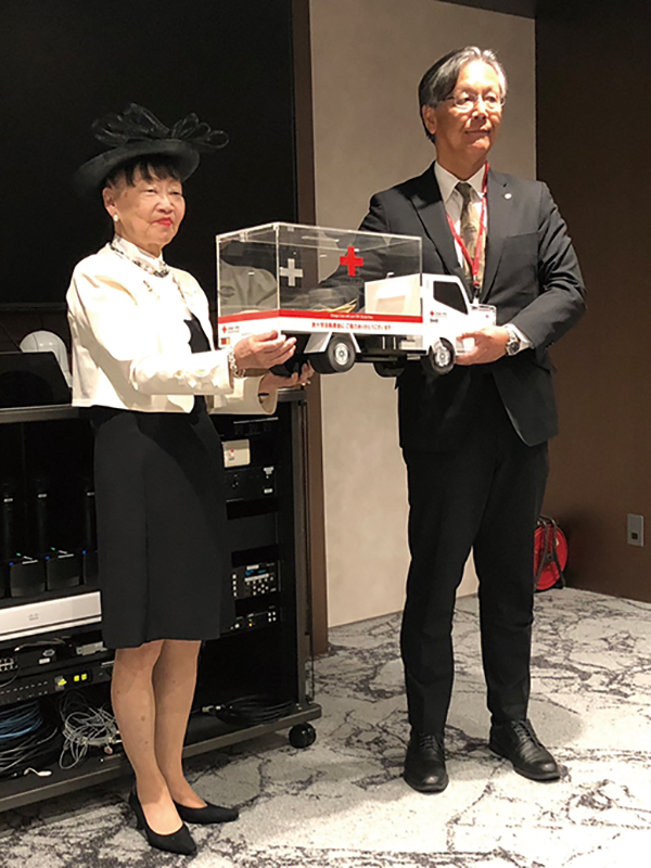 会場は熱気で溢れ、巨人・ヤクルト・ロッテなど野球選手サイン入りユニホームやバットなども有り3時間に渡り繰り広げられた後、アパホテル元谷芙美子社長から、日本赤十字社の石川県支部 事務局長 小嶋氏に当日オークション金額615万円が能登復興支援金として寄贈された。