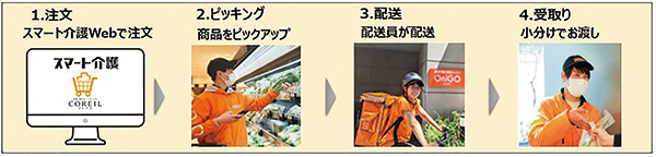 「スマート介護」Webサイト内に新たに開設する「COREIL Fresh」のページから希望の商品を選んで、介護施設のスタッフが注文。15時までの注文で、近隣スーパーからの配送により、当日中に商品を受け取ることができる。