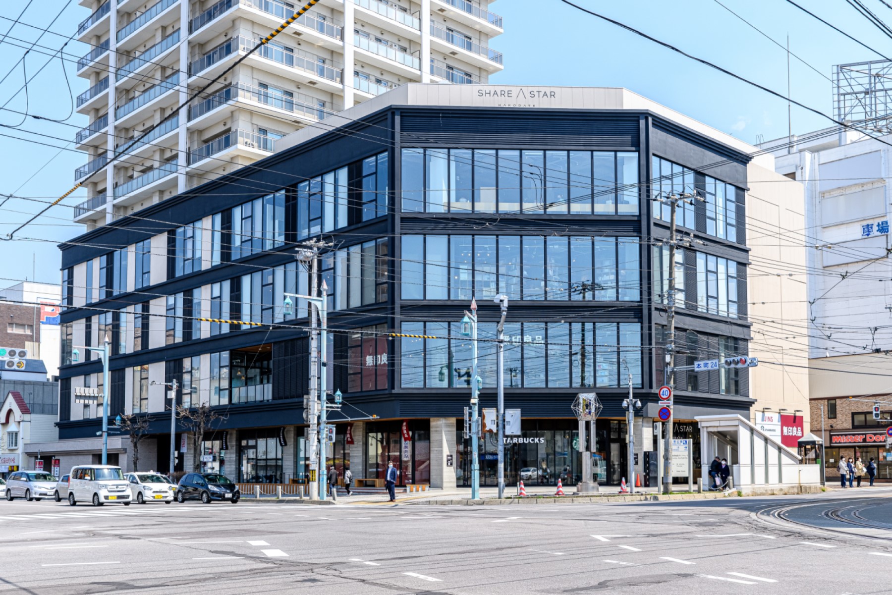 「シエスタハコダテ」は、函館市電「五稜郭公園前」停留所のすぐそばに位置し、地下1階から3階は商業施設、4階は公共施設「函館コミュニティプラザ」、上層階は住宅という複合ビル。