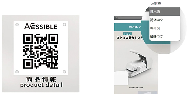 このコードをスマートフォンで読み込むことで外国人、視覚障がいのある方でも多言語表記や音声情報を通じて商品の特徴や使い方を理解することができる。