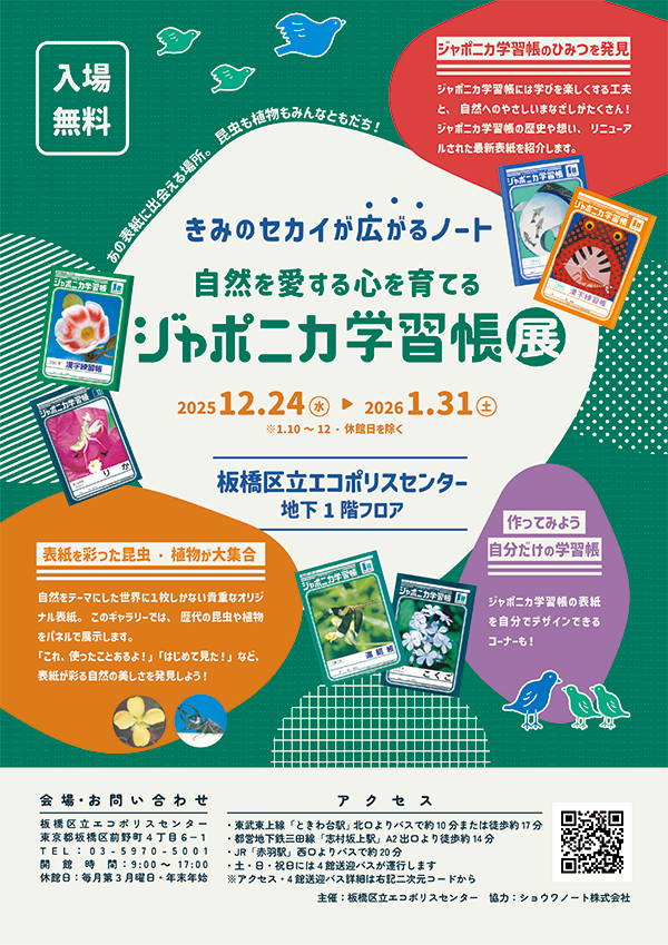 ショウワノートの「ジャポニカ学習帳」をテーマにした展示会「きみのセカイが広がるノート 自然を愛する心を育てる ジャポニカ学習帳展」が、2025年12月24日から2026年1月31日、東京・前野町の板橋区立エコポリスセンターで開催される。
