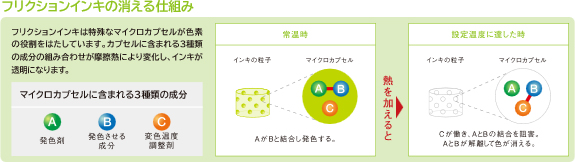 「フリクションインキ」は、「発色剤」と「発色させる成分」、「変色温度調整剤」の3つの成分をマイクロカプセルに内包し、インキの色素としたものだ。