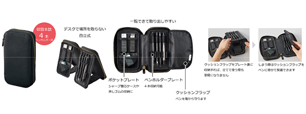 独自の“クッションループ”で1本1本を大事に収納しながら、最大限に筆記具を見せる。