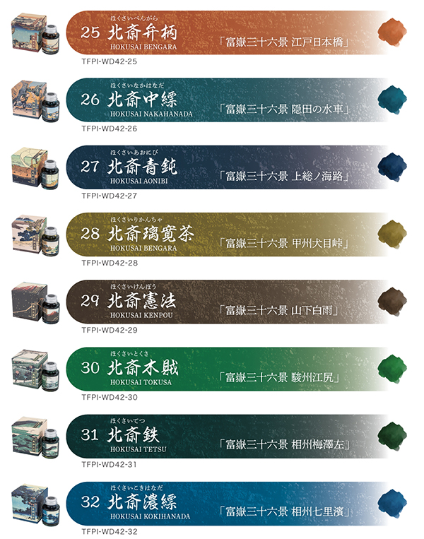 過去にも「葛飾北斎」をテーマとした浮世絵インク(北斎濃藍や北斎錆緑など)が発売されているが、今回は再び北斎をテーマとし、新たなラインナップを加える。