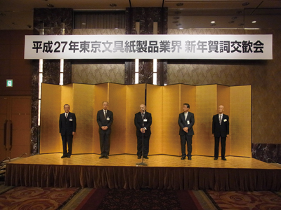 5団体トップが壇上に揃い、当番団体である東京文紙事務器卸協同組合の原田政樹理事長(東京クラウン社長)は、「今年はアベノミクスが起爆剤になり、景気上昇への期待がかかる。恩恵を得るのではなく、積極的に商機を取り込んでいこう。ここ10年の向かい風も気持ち一つでフォローに変わる。積極的に果敢な商いに期待したい。我々が風を起こしていかなければいけない」と挨拶した。