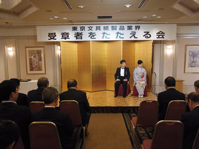 これに先立つ午後5時に同所でゼブラ石川眞一社長の藍綬褒章受章をたたえる会が行われ、多数の業界関係者が出席の中で、石川夫妻へ祝いのことばが贈られ、記念品が贈呈された。